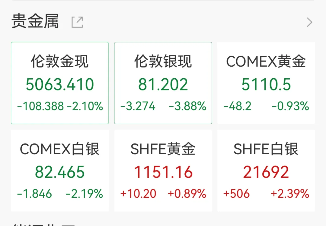 3月9日,现货黄金、现货白银下挫,截至7:43,现货黄金向下跌破5100美元,日内下跌2.1%。现货白银跌3.88%,报81.202美元/盎司。