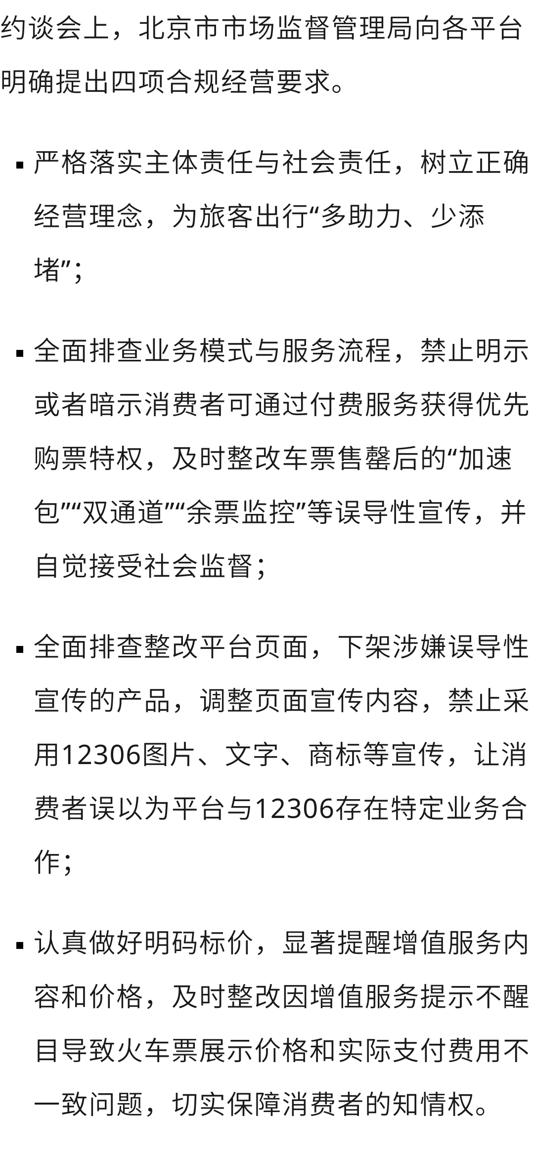 近日,北京市市场监督管理局组织携程、去哪儿、飞猪、同程、美团、京东、航旅纵横、高铁管家、滴滴、高德地图、百度地图、腾讯地图等12家涉及火车票网络销售业务的主流平台,重点围绕群众反映强烈的网络销售火车票突出问题召开行政约谈会。