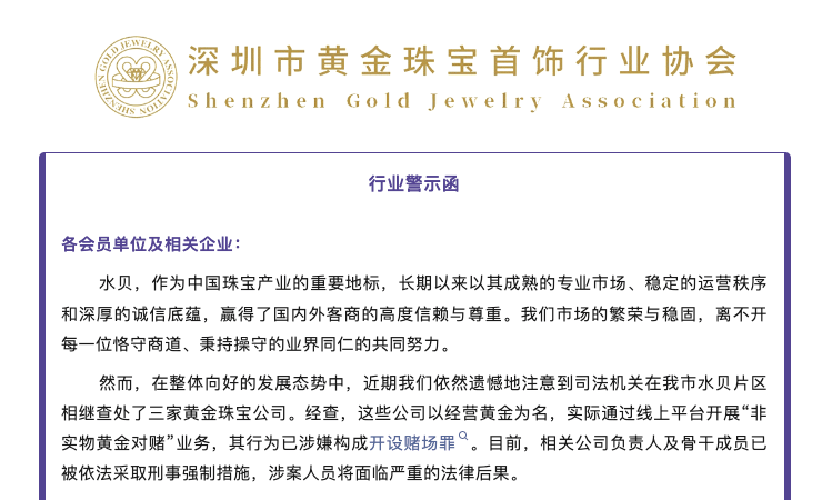 10月12日消息 昨日,深圳市黄金珠宝首饰行业协会官方发布行业警示函,其中提到,深圳水贝三家黄金珠宝公司被司法机关查处。这些公司以经营黄金为名,实际通过线上平台开展“非实物黄金对赌”业务,其行为已涉嫌构成开设赌场罪。