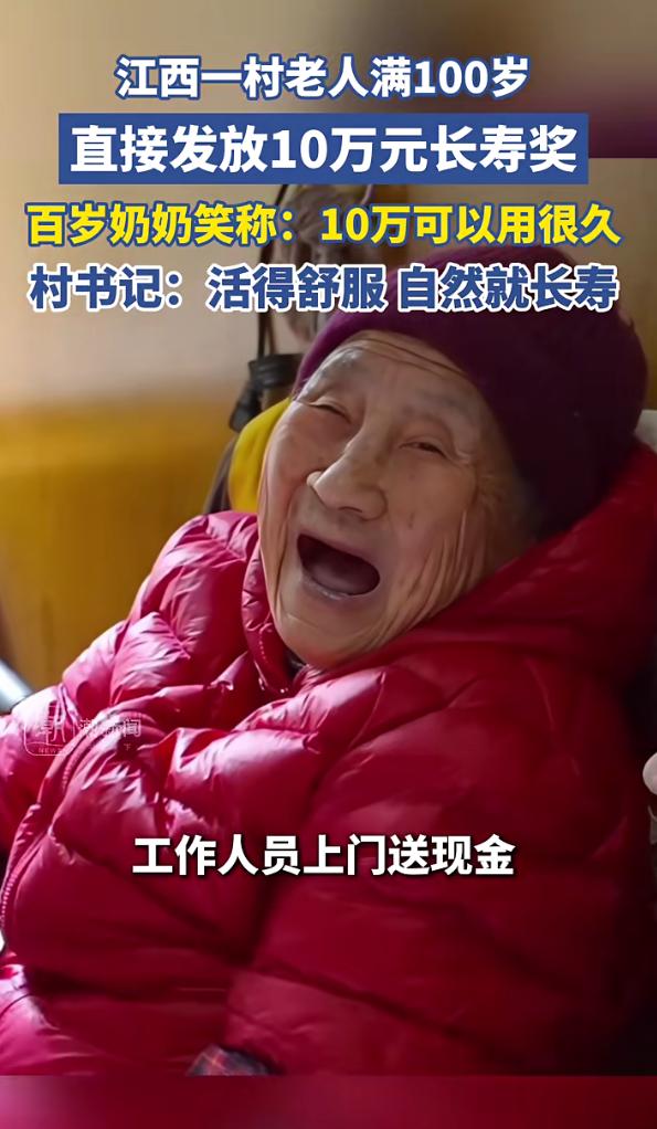 近日,江西南昌,进顺村出了第一位100岁老人。老人耳聪目明,还能织毛线。按村里政策,满100岁直接领10万元,工作人员送钱上门!老人高兴地说:“10万元很耐用。”