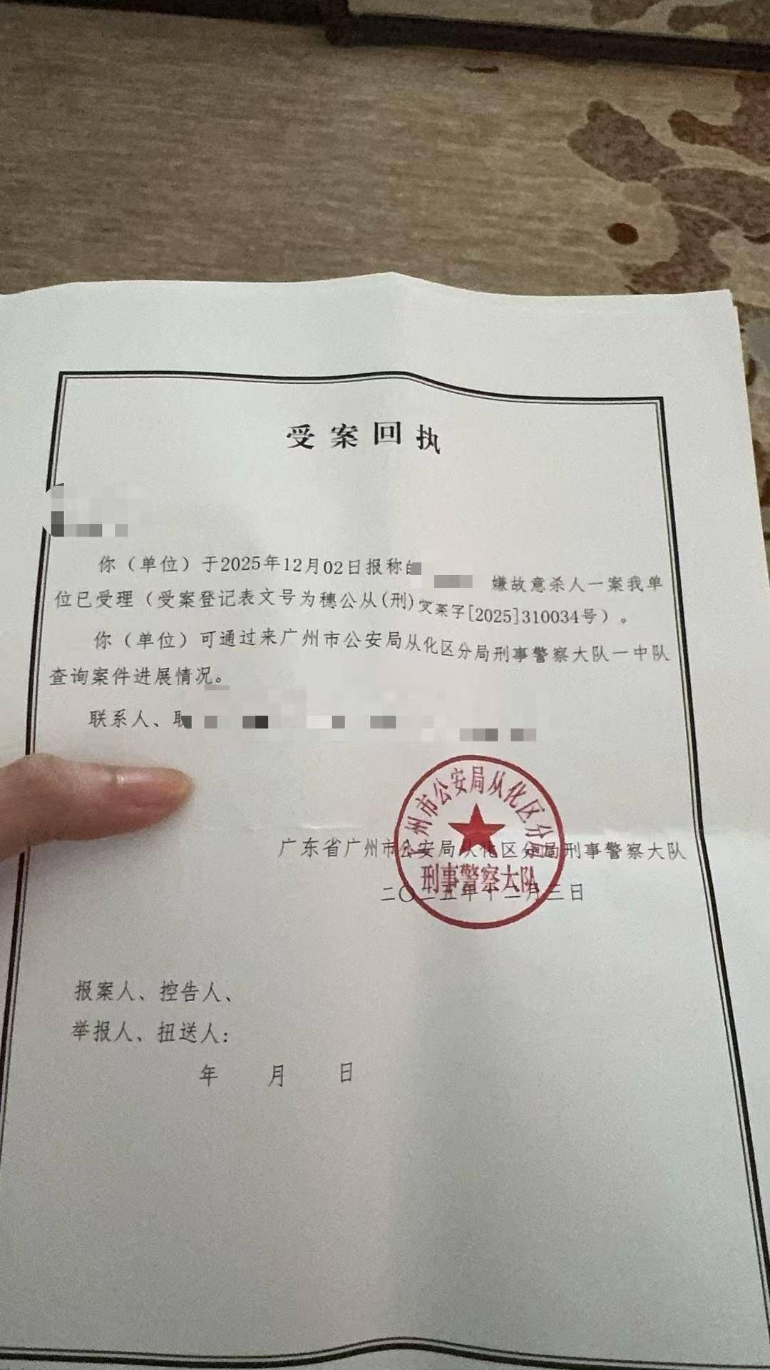 邝女士提供的受案回执显示,从化区分局刑事警察大队于12月3日受理了李某某涉嫌故意杀人一案。为确定孩子的死亡原因,12月4日,分局在从化区殡仪馆对三具尸体进行解剖检验。邝女士告诉记者,尸检结果显示:三名儿童系被他人勒颈窒息死亡。