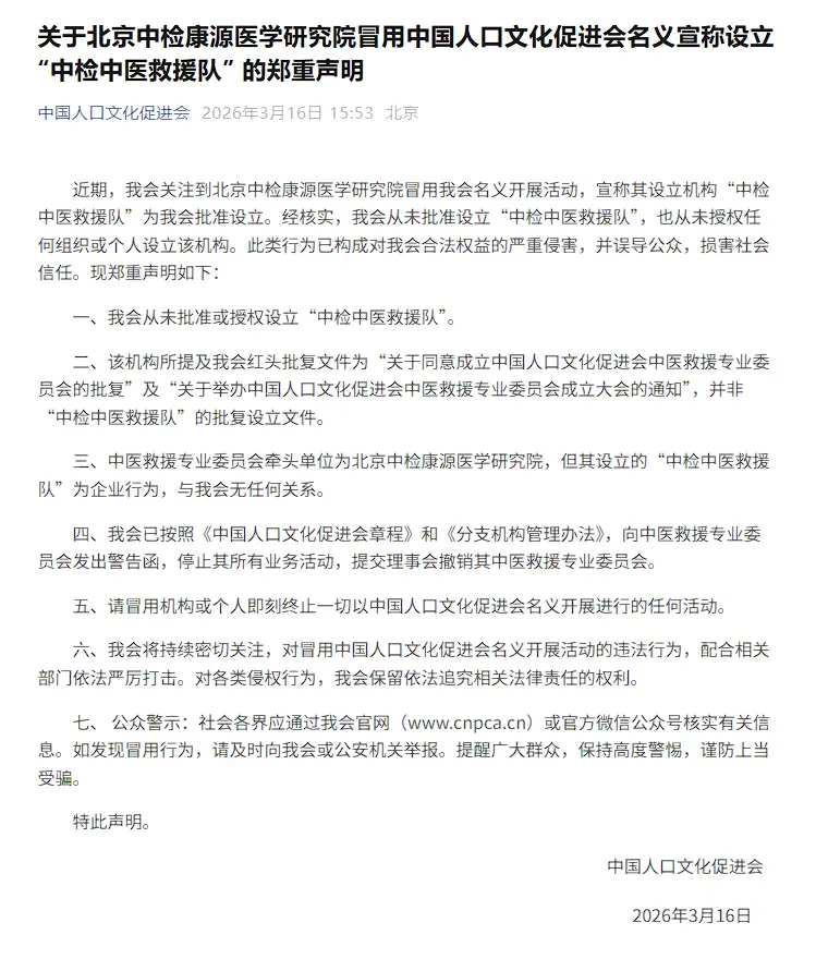 该《关于北京中检康源医学研究院冒用中国人口文化促进会名义宣称设立“中检中医救援队”的郑重声明》显示,近期,该会关注到北京中检康源医学研究院冒用该会名义开展活动,宣称其设立机构“中检中医救援队”为该会批准设立。经核实,该会从未批准设立“中检中医救援队”,也从未授权任何组织或个人设立该机构。此类行为已构成对该会合法权益的严重侵害,并误导公众,损害社会信任。现郑重声明如下: