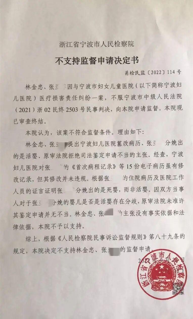 扬子晚报紫牛新闻记者看到,林金忠在一审及二审上诉书中,均提及要求委托鉴定机构对宁波妇儿医院诊疗行为进行鉴定,但未获准许。此后,他向浙江省高级人民法院申请再审被驳回。林金忠又向最高人民法院反映相关情况,最高院回复,向人民检察院申请检察建议或抗诉,但未获检察院支持。