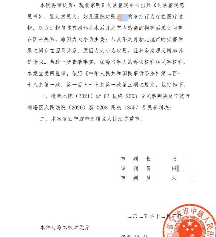 2025年1月,林金忠取得了由北京明正司法鉴定中心出具的医疗鉴定书,案件迎来转折。同年10月,林金忠收到了宁波市中级人民法院的民事裁定书,裁定本案由该院再审,再审期间,中止原判决的执行。12月3日,宁波中院再次裁定,撤销原一、二审判决,将本案发回宁波市海曙区人民法院重审。