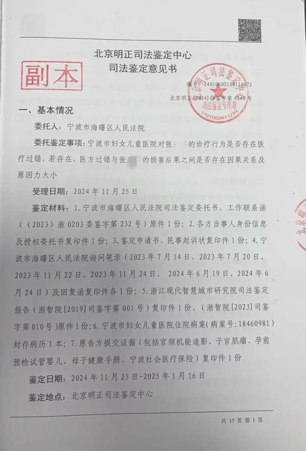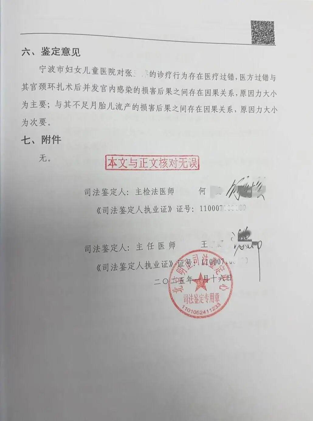 林金忠向记者提供了一份由北京明正司法鉴定中心出具的医疗鉴定书,该鉴定意见称:“宁波市妇女儿童医院对张女士的诊疗行为存在医疗过错,医方过错与其宫颈环扎术后并发宫内感染的损害后果之间存在因果关系,原因力大小为主要;与其不足月胎儿流产的损害后果之间存在因果关系,原因力大小为次要。”鉴定日期为2025年1月16日。