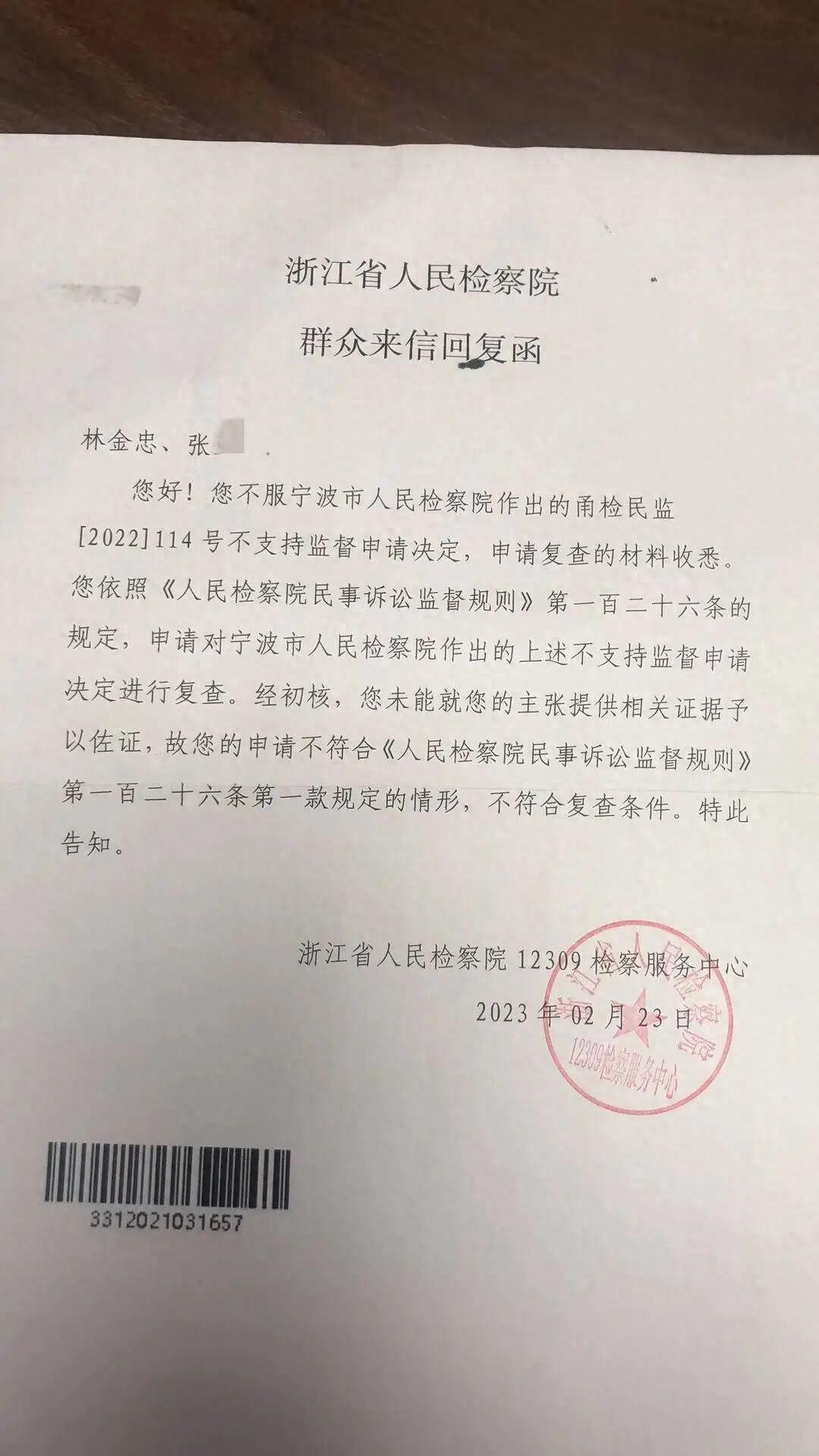 图为林金忠申请监督的材料被宁波市检察院驳回