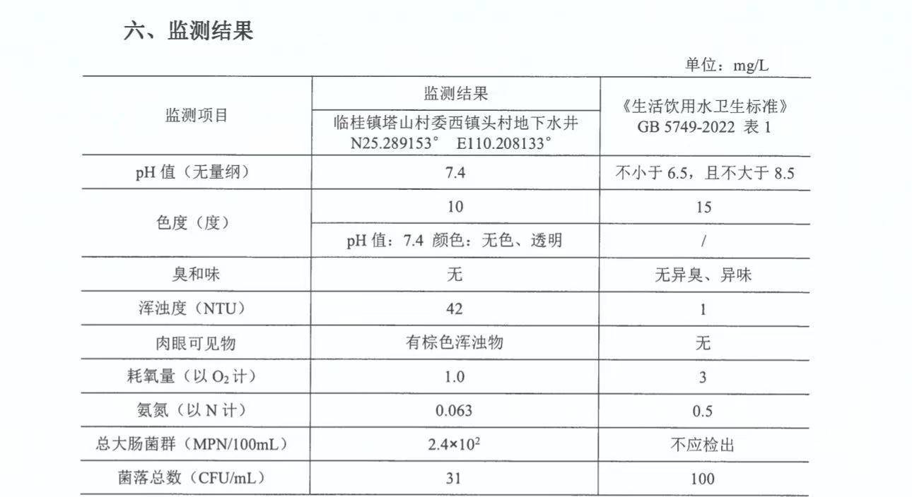 西镇头村一位受访村民向红星新闻记者提供了一份其委托水质检测机构经水样检测出具的检测报告,报告显示水样浑浊度为42,报告引用的《生活饮用水卫生标准》规定的浑浊度数值为“1”,在肉眼可见物一栏,报告载明有棕色浑浊物,按照标准应为无;总大肠杆菌一栏水样检测结果为2.4×10²MPN/100ml,而按照标准不应检出。