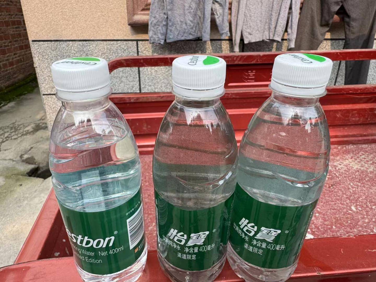 ▲记者从水管里接到矿泉水瓶的水体,左一为正常矿泉水作为对比,中间和右一为不同时间段所接水体,细看都有悬浮物 祁彪 摄