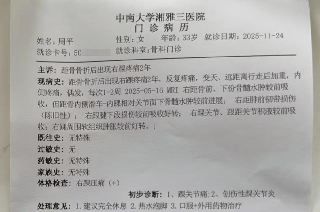 2025年7月9日,湘雅三医院的门诊病历记载,此时的周平依旧“右踝疼痛两年余”,医院初步诊断其为踝关节痛、右胫距关节骨髓水肿。院方建议其休息,避免劳累,减少踝关节负重及活动。