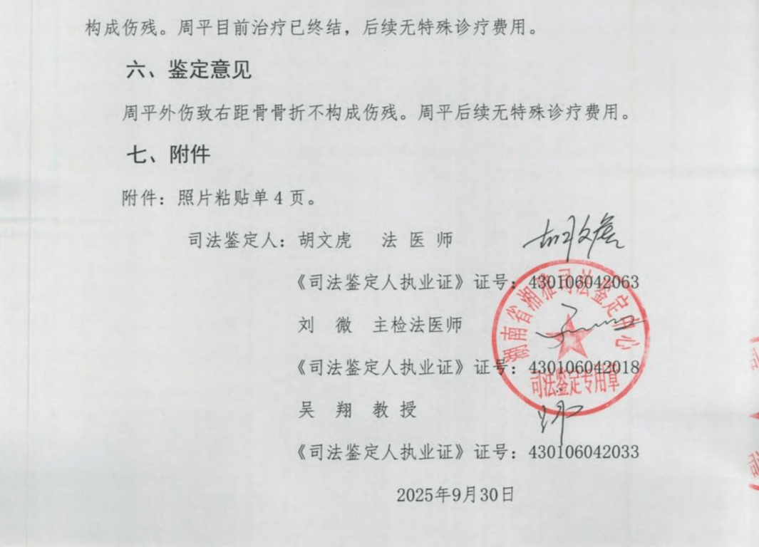 湖南省湘雅司法鉴定中心于2025年9月30日作出的《司法鉴定意见书》则称,依照《人体损伤致残程度分级》相关条款规定,周平外伤致右距骨骨折不构成伤残。