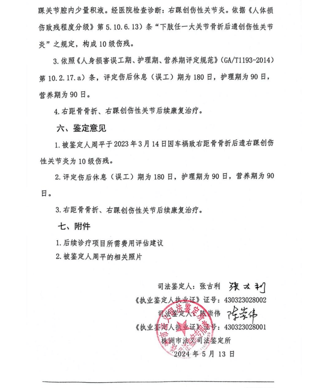 2024年5月13日,株洲市法义司法鉴定所作出的《司法鉴定意见书》称,根据患者周平的受伤史、住院治疗、影像学检查及法医临床检验,被鉴定人周平伤后的临床诊断“右踝创伤性关节炎”“右踝关创伤性关节痛”等,依据充分,予以认定。